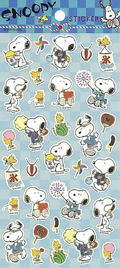 スヌーピーの和風デザイン。高さ175mm幅90mmの大判ステッカーです。和紙のようなテイストの紙を使用して金箔をデザインに取り込んでいます。